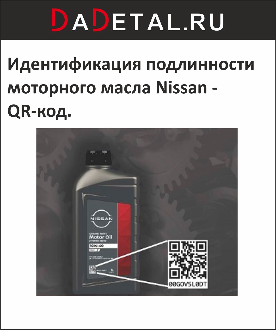 Информируем Вас об изменении дизайна оригинальных канистр масла Nissan, начиная с января 2022 года. Новые канистры масла будут представлены на рынке в тёмно-сером исполнении. Также обращаем Ваше внимание на используемый метод идентификации подлинности масла - QR-код. Для исключения копирования QR-кода с оригинальной канистры, он покрыт специальным невидимым защитным слоем, отсутствие которого распознается автоматически.