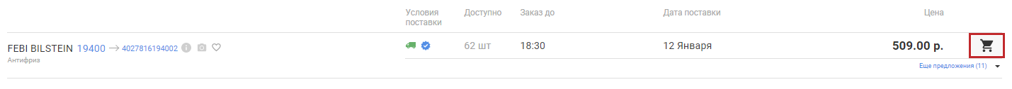 - Выберите подходящее предложение, нажмите на кнопку "Корзина" (рис. 1), укажите количество товара, добавьте деталь в Корзину. (рис. 2)