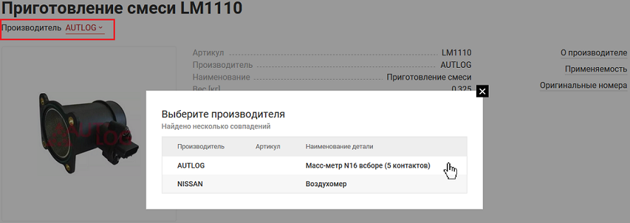Если по вашему запросу найдутся детали нескольких производителей – выберите интересующего (Рис. 2). Система произведёт поиск и отобразит все доступные варианты поставки выбранного артикула, его аналогов и замен. (Рис. 3).