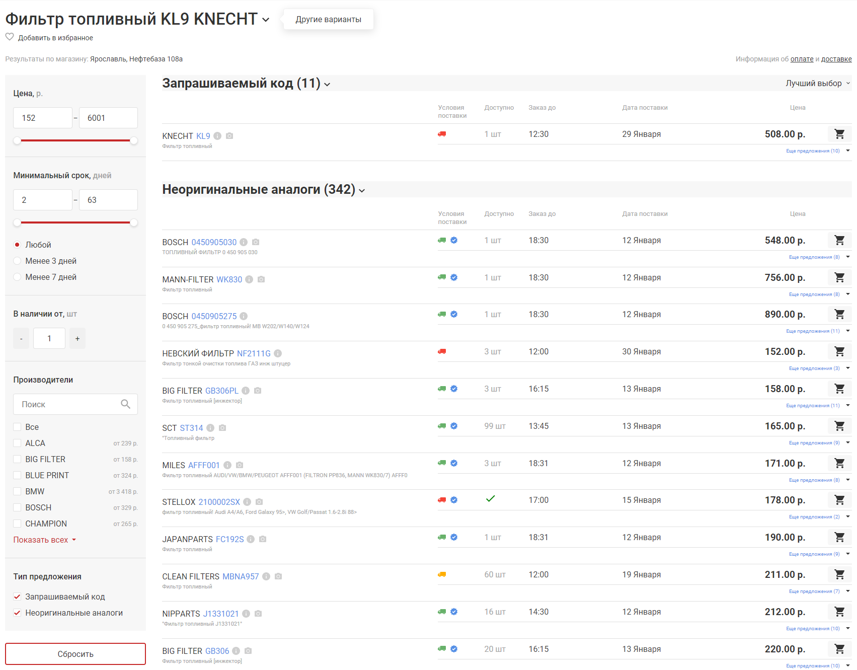 Слева от списка предложений присутствует блок с фильтрами, где Вы сможете отсортировать результаты поиска по цене, сроку, наличию и производителю.
